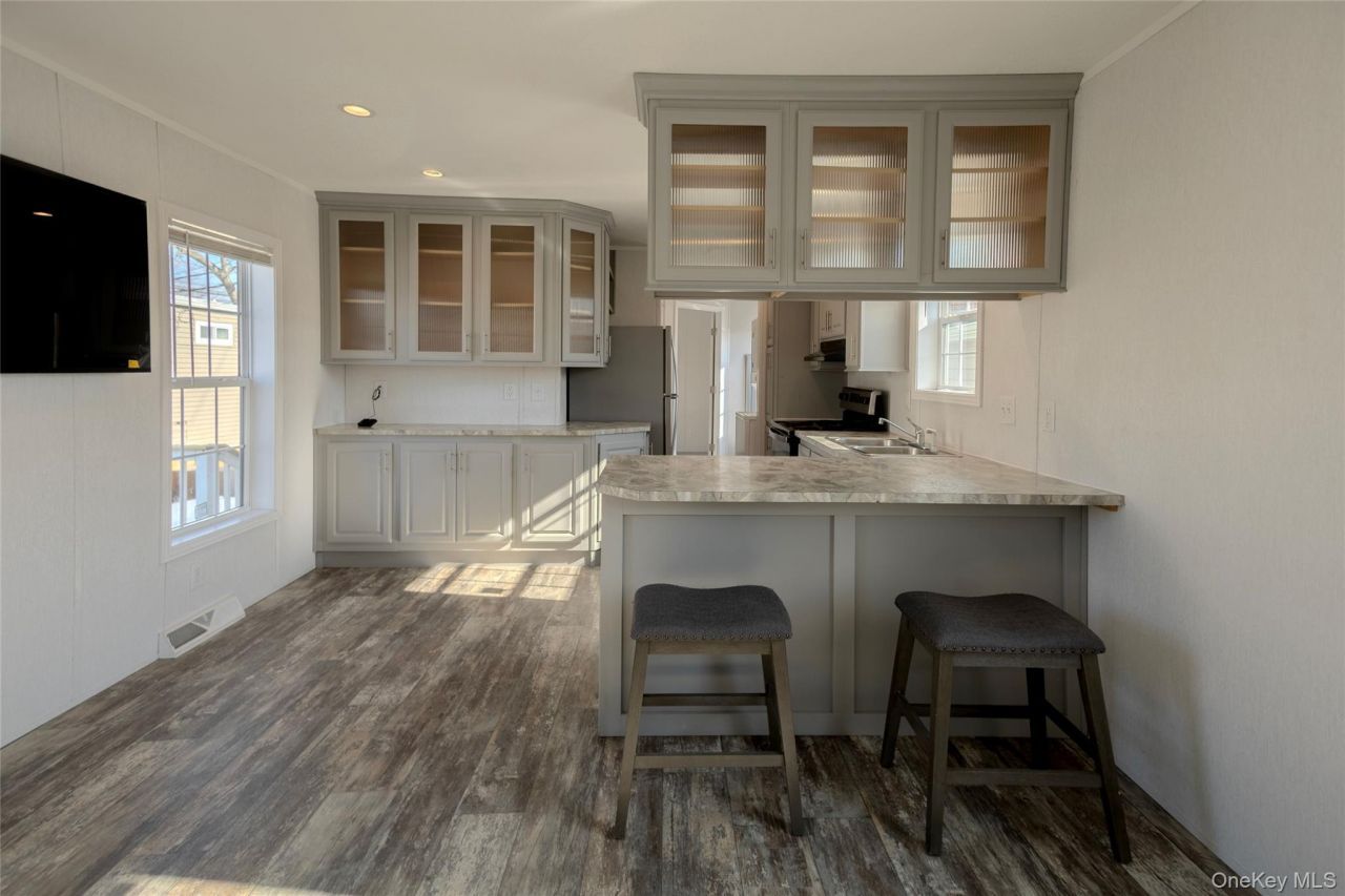 This beautifully renovated, spacious 2-bedroom, 1-bath home offers comfort and convenience in one of Islip's most desirable manufactured home communities, complete with a washer and dryer hook-up. Featuring newly upgraded flooring throughout and a renovated bathroom/kitchen, the home provides a bright, open layout with plenty of natural light.This is an outright purchase of the home, with a monthly land lease of $1,130 covering water, sewer, garbage removal, property taxes, snow removal, and one designated parking space. Additional parking is available for an extra $20 per month for a second vehicle.Community perks include: - Access to boat slips up to 24 feet- A peaceful waterfront setting- No age restrictions - A pet policy allowing one indoor cat (no dogs permitted).Additional highlights: - Propane cooking & hot water, and a TV included as a gift. - Unlike traditional homes, one of the unique benefits of this mobile home is its portability. If life takes you to a new town or state, you can bring your home with you!Located in the heart of Islip, this home is just moments from shopping, dining, and transportation.
