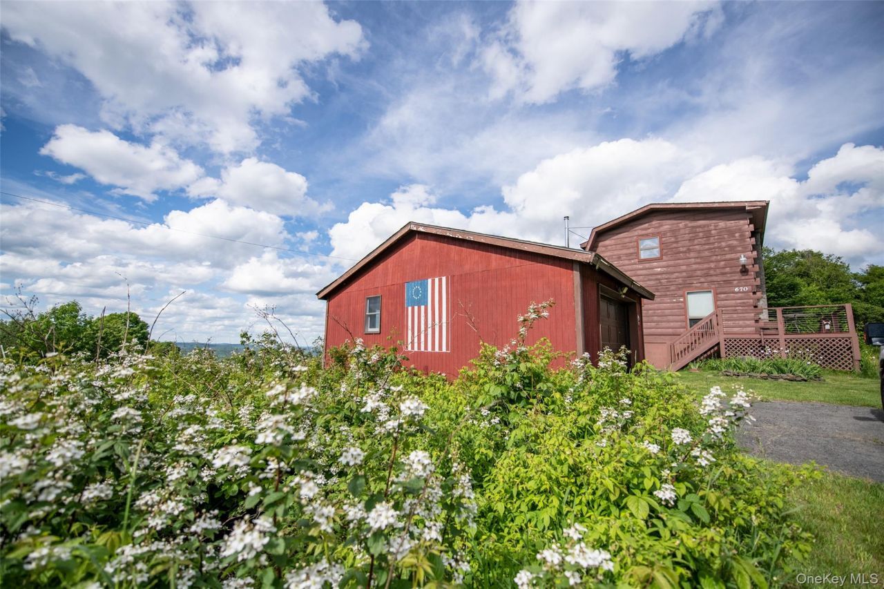 Serene Log Cabin with Breathtaking Valley Views on 10 Private Acres. Step into a picture-perfect escape: this three-bedroom, three-bath log cabin perched above the sweeping river val offers panoramic views, cozy ambience, and effortless access to nature. With rustic timber construction, large picture windows, and an oversized wraparound deck ideal for morning coffee, afternoon lounging, or evening stargazing-it's the perfect blend of comfort and wilderness. Inside, you'll find warm wood-tones, and an open living area anchored by a classic wood-burning stove, with modern amenities thoughtfully integrated for ease and charm. The primary suite provides tranquil views from its private balcony, while two additional bedrooms offer plenty of space for family or guests. Outside, the 10-acre lot offers privacy, open lawns, and mature forest, with a detached extra-large one car garage perfect for workshop space, storage, or future conversion. Just minutes from charming mountain village shops, hiking trails, river access, and Catskills farm stands, this property invites you to unwind, breathe deep, and live slow with the ever-changing splendor of nature as your backdrop. If you're looking for a turnkey, rental-ready investment, or maybe for some extra income when you're not enjoying it yourself, this cabin delivers the kind of timeless appeal that makes people stop scrolling. Come see, and imagine the possibilities of making this special escape your own.